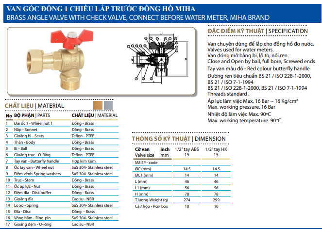 Van góc đồng 1 chiều lắp trước đồng hồ miha