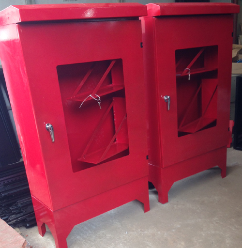 Được làm bằng tôn thép khối hàn và thiết kế kích thước theo nhu cầu chứa vật tư chữa cháy có các loại như